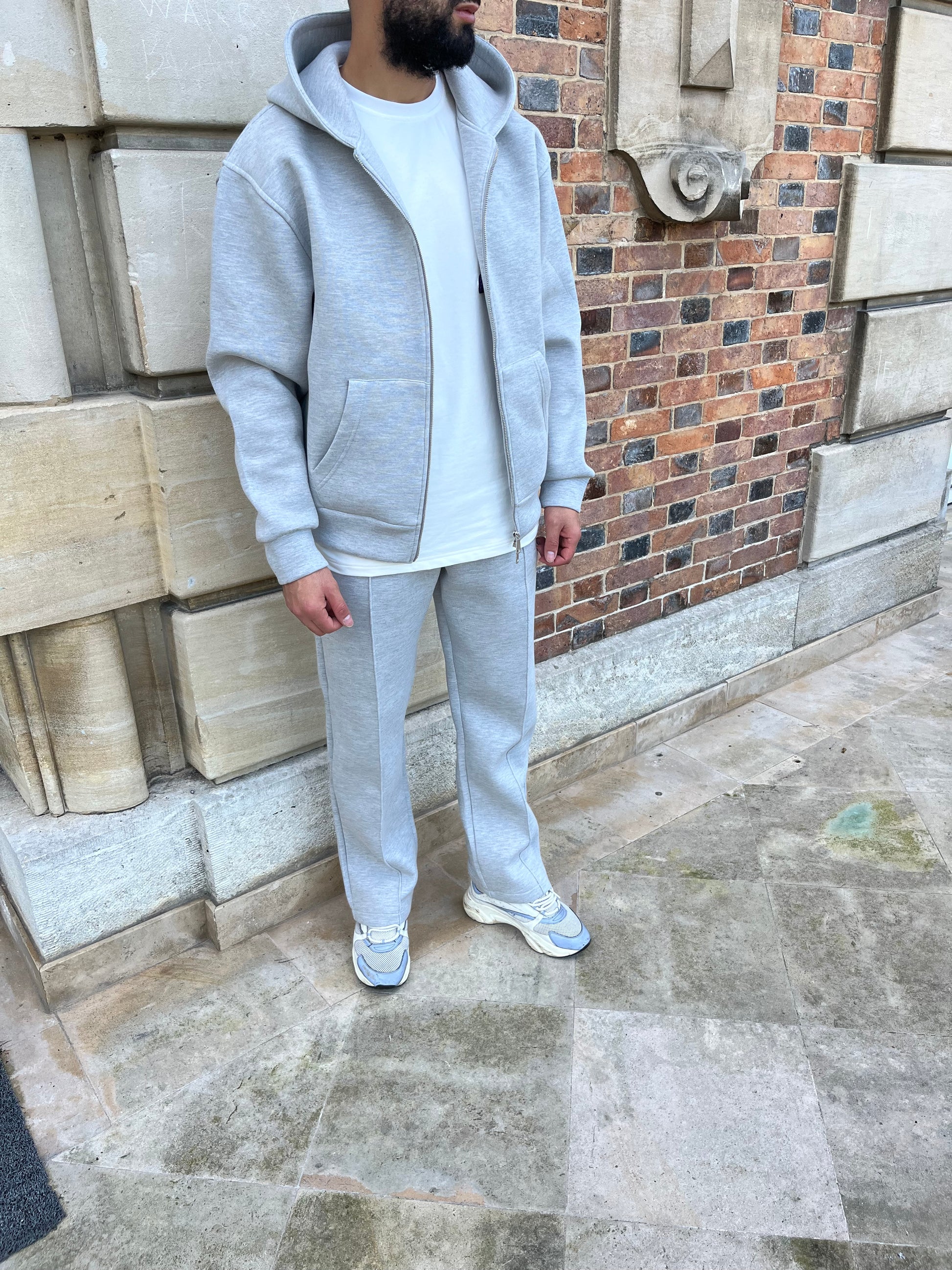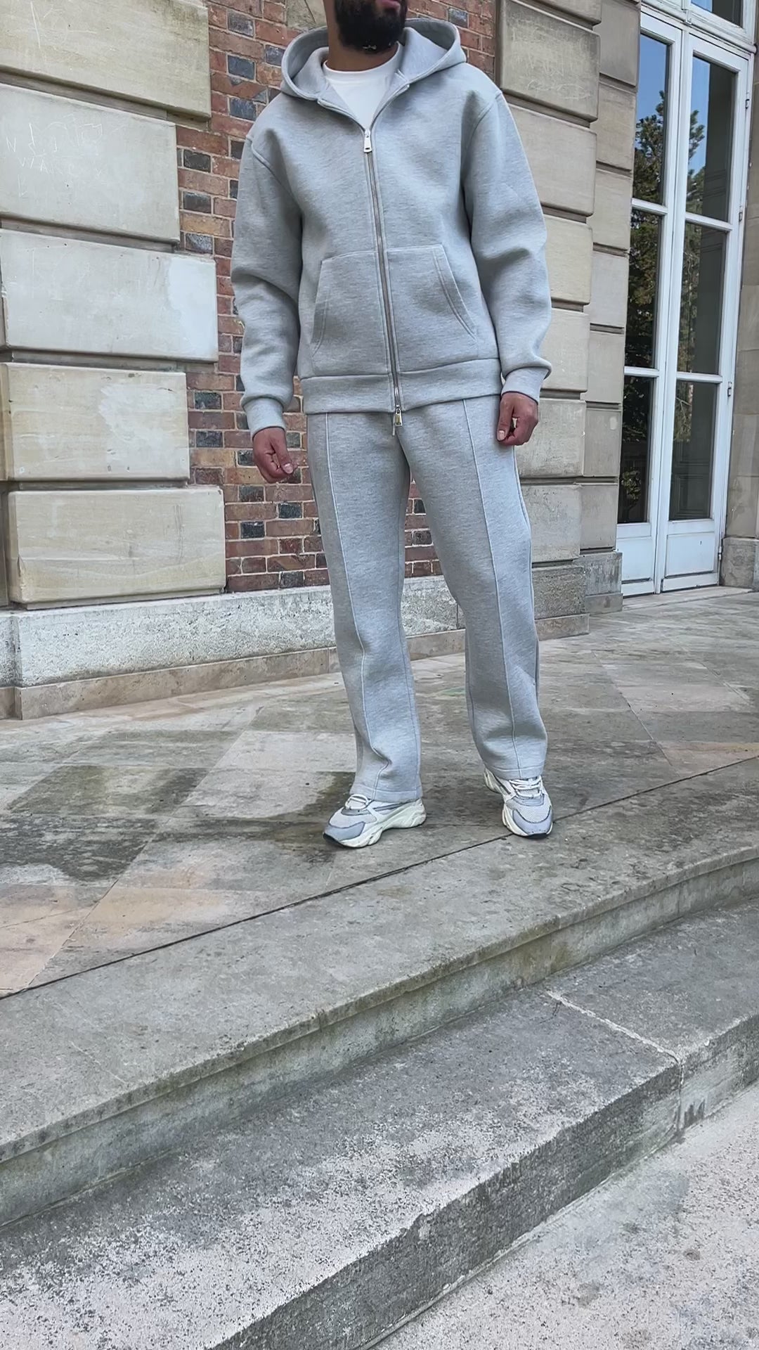 Adopte un look casual et tendance avec cet ensemble gris composé d’une veste à capuche zippée et d’un pantalon assorti. Conçu pour allier confort et style, il est parfait aussi bien pour une journée détente que pour un look street chic assumé.