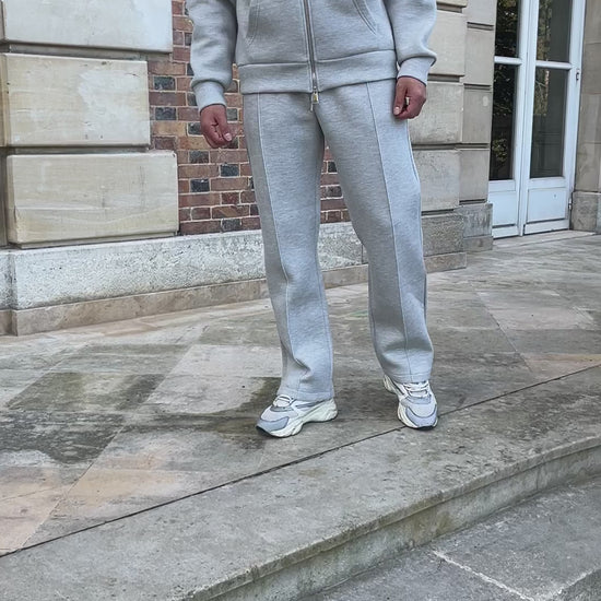 Le pantalon gris est rehaussé de deux bandes contrastantes sur chaque jambe, apportant une touche dynamique et moderne. La coupe est confortable et taille parfaitement, pour un tombé impeccable sur toutes les morphologies.